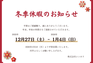 HOME > お知らせ お知らせ SHINHORITOPIC新着情報イベントブログ RECOMMENDED NEWS 【株式会社シンホリ】2026年新年のご挨拶 2026.01.01新着情報 【重要】代表名・会社名を騙り、LINEグループ作成を依頼する詐欺メールに関する注意喚起 2025.12.26新着情報 【SHINHORI REGULAR BLOG#033】~ホウ酸~ 2025.12.26ブログ ブログ 【SHINHORI REGULAR BLOG#32】~何のために、誰のために~ 2025.12.12 新着情報 年末年始休業のお知らせ 2025.12.01 ブログ 【SHINHORI REGULAR BLOG#031】~もしもの備え~ 2025.11.28 SHINHORITOPIC SHINHORI TOPIC 11月号発行しました 2025.11.25 ブログ 【SHINHORI REGULAR BLOG#030】~家づくりを支える、プレカット… 2025.11.14 ブログ 【SHINHORI REGULAR BLOG#029】~ワークライフバランス~ 2025.10.24 ブログ 【SHINHORI REGULAR BLOG#028】~測定師~ 2025.10.10 イベント はんだオープンファクトリー2025に参加します! 2025.10.09 ブログ 【SHINHORI REGULAR BLOG#027】~想い~ 2025.09.26 1234»